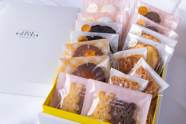 パウンド各種2点ずつ、クッキー各種3点ずつ、マドレーヌ2点、フロランタン3点、どうぶつクッキー2点が入った焼き菓子セット 原材料: ○パウンドバニラ(砂糖、小麦粉、鶏卵、バター(大豆由来)、洋酒/香料、膨張剤) ○パウンドショコラ(砂糖、小麦粉、鶏卵、バター(大豆由来)、ココアパウダー、洋酒、チョコレート加工品/香料、膨張剤) ○クッキーバニラ(小麦粉、アーモンドパウダー、バター(大豆由来)、砂糖、鶏卵/香料) ○クッキーショコラ(小麦粉、バター(大豆由来)、砂糖、鶏卵、チョコレート加工品、ココアパウダー/香料)) ○マドレーヌ(鶏卵、砂糖、バター(大豆由来)、小麦粉、アーモンドパウダー、はちみつ/香料、膨張剤) ○フロランタン(小麦粉、バター(大豆由来)、砂糖、鶏卵、アーモンド、生クリーム/香料) ○どうぶつクッキー(小麦粉、アーモンドパウダー、ココアパウダー、バター(大豆由来)、砂糖、鶏卵/香料) 保存期間:賞味期限参照 保存方法:直射日光、高温多湿を避け、なるべくお早めにお召し上がり下さい。